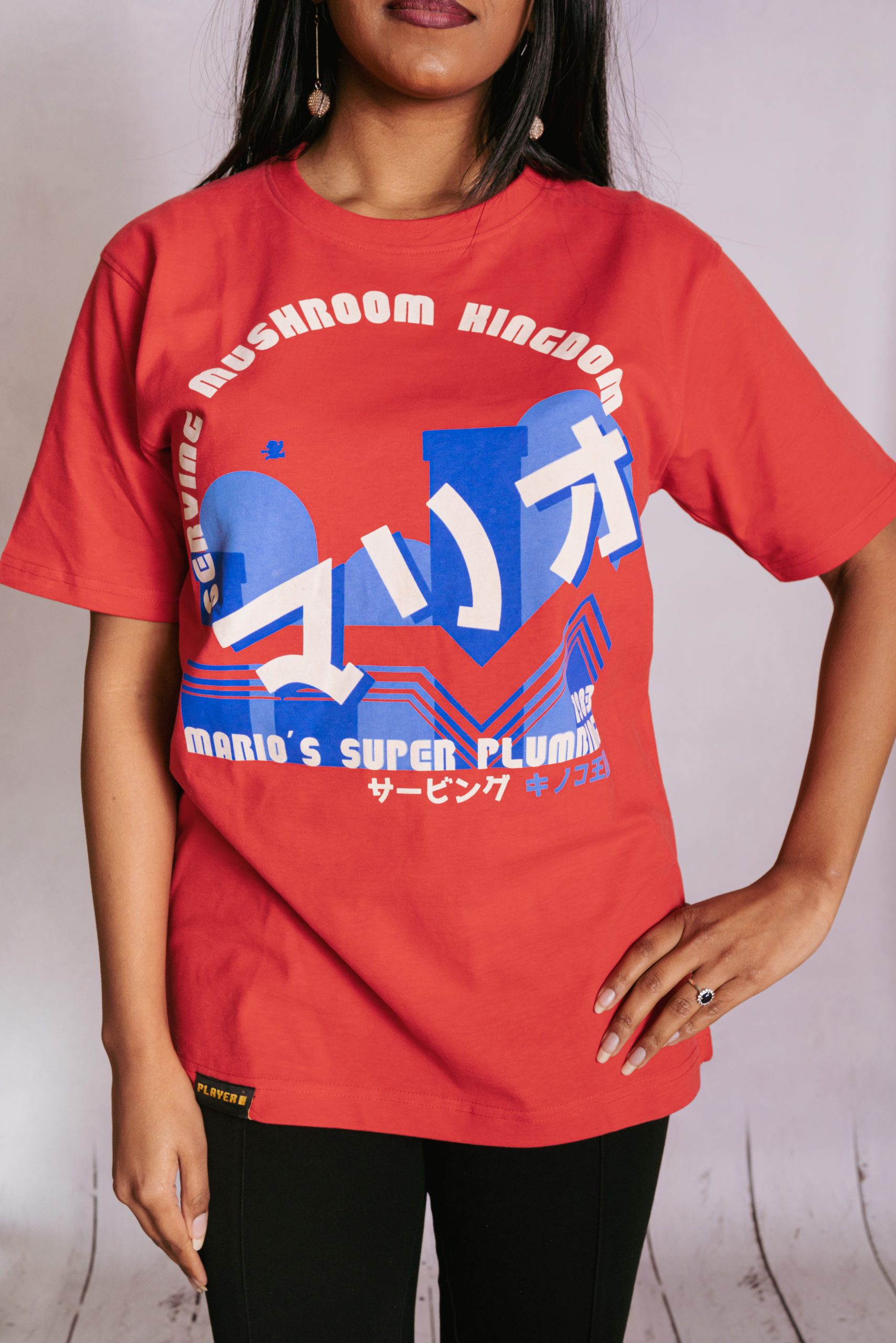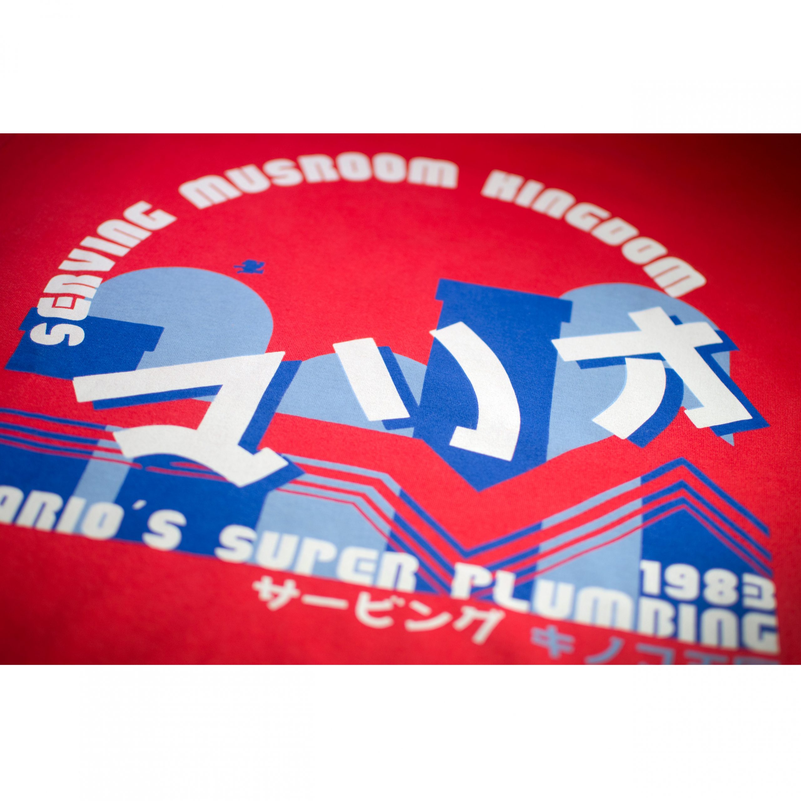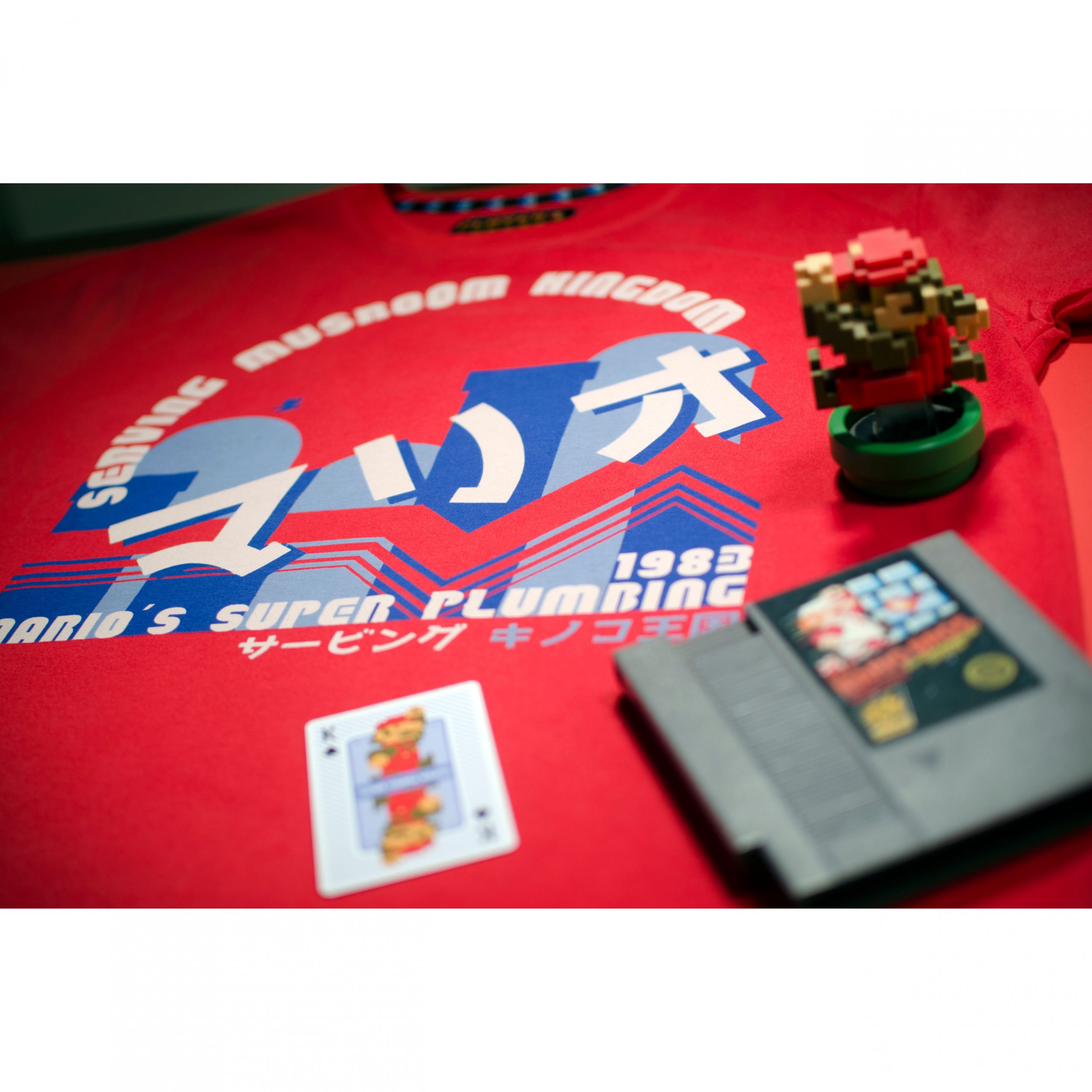 The design: This collection, features Mario, who is one of the most Iconic and enduring characters in video game history. The main logo gives a backdrop of him jumping across the hills and pipes in one of the iconic levels that he is famous for. We have imagined that he is through with saving Princess Peach, and has started a plumbing business in Mushroom Kingdom. The year 1983 relates to his video game debut as Mario. As with the entire range, we have referenced the retro Famicom swoosh that was present on the original NES/Famicom game releases. The Japanese kanji reads “serving mushroom kingdom”.