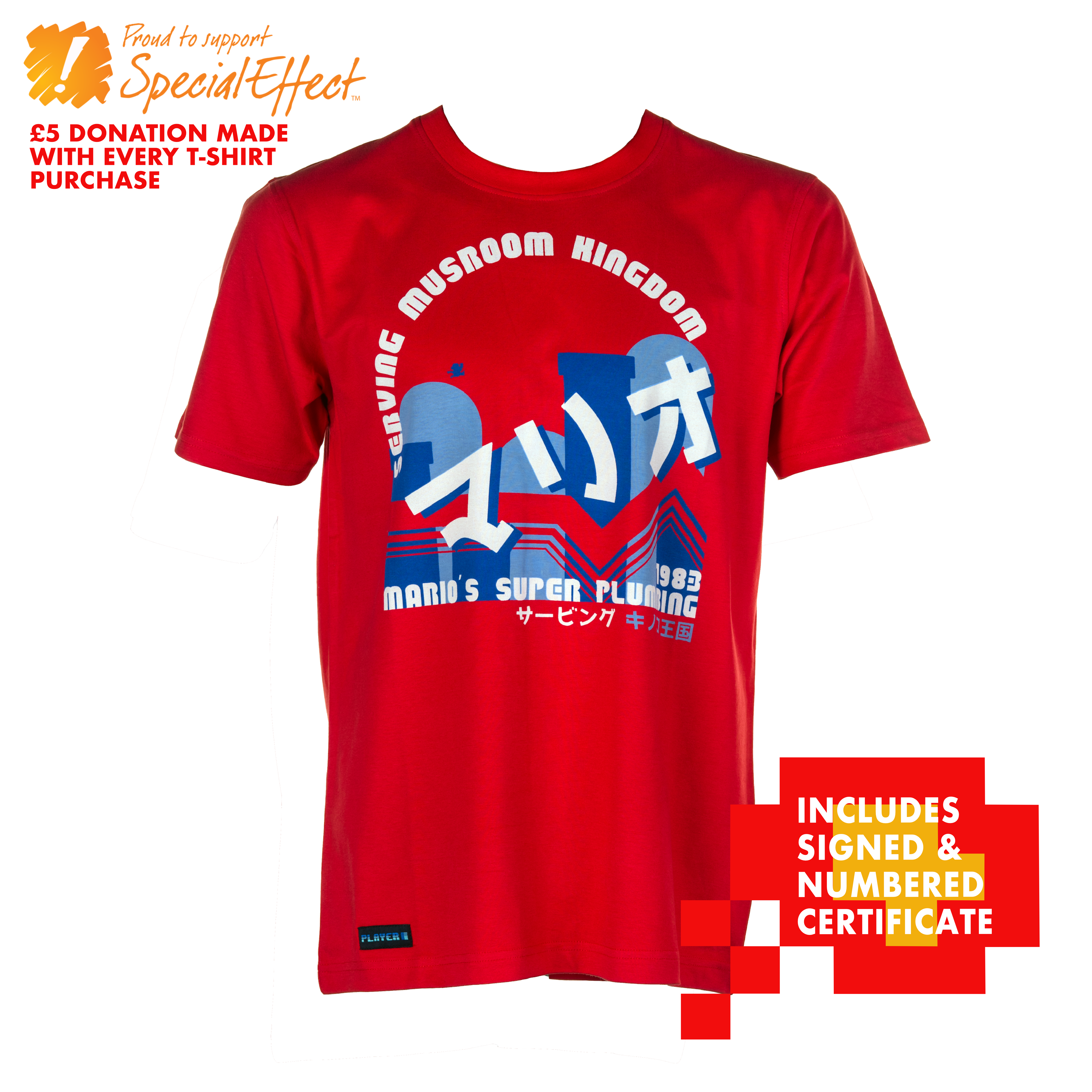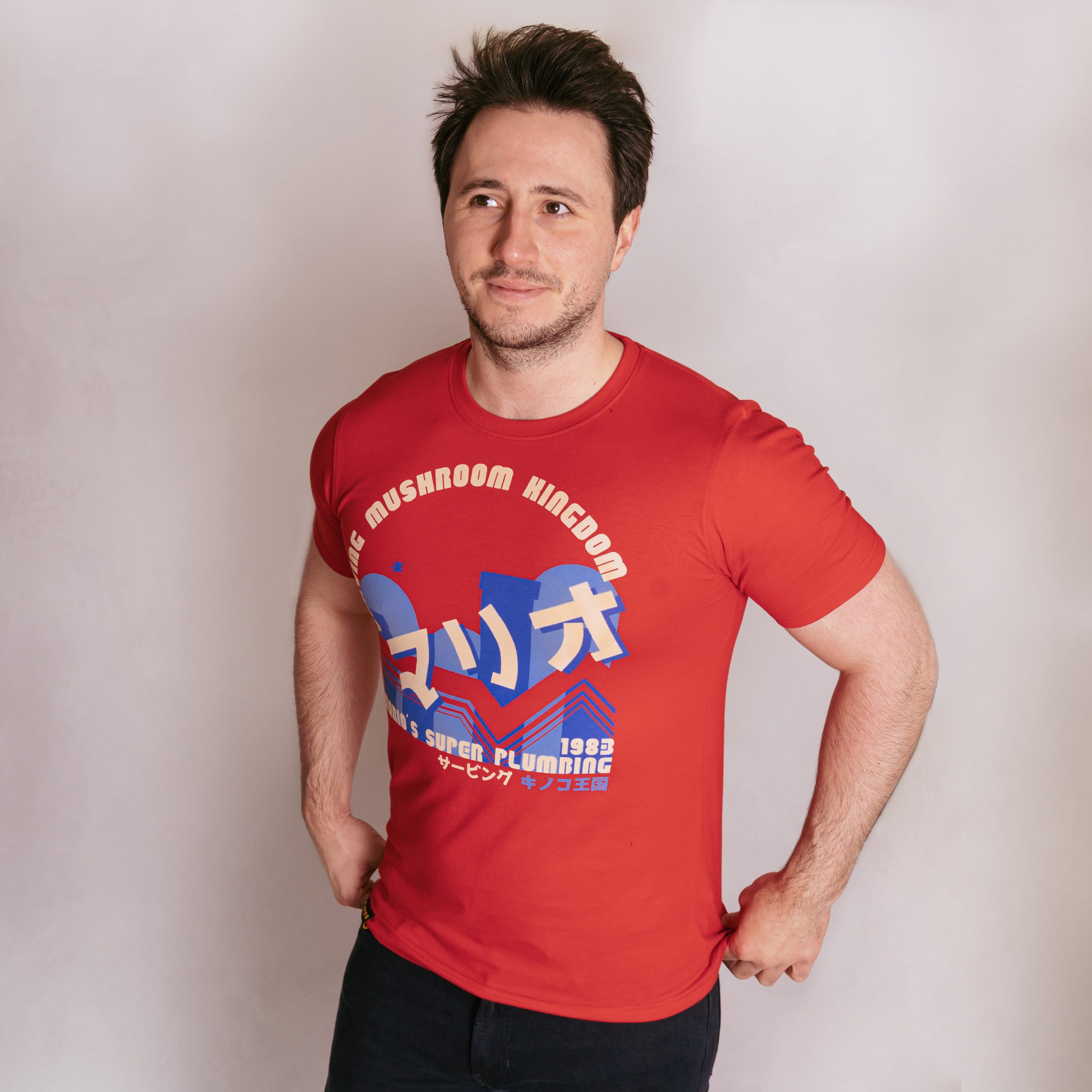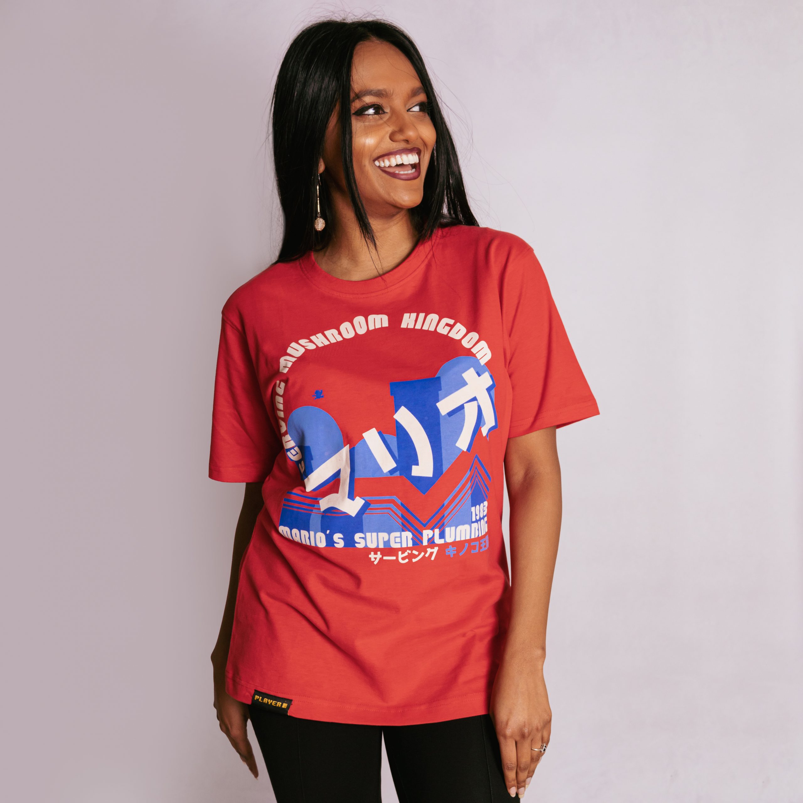 The design: This collection, features Mario, who is one of the most Iconic and enduring characters in video game history. The main logo gives a backdrop of him jumping across the hills and pipes in one of the iconic levels that he is famous for. We have imagined that he is through with saving Princess Peach, and has started a plumbing business in Mushroom Kingdom. The year 1983 relates to his video game debut as Mario. As with the entire range, we have referenced the retro Famicom swoosh that was present on the original NES/Famicom game releases. The Japanese kanji reads “serving mushroom kingdom”.