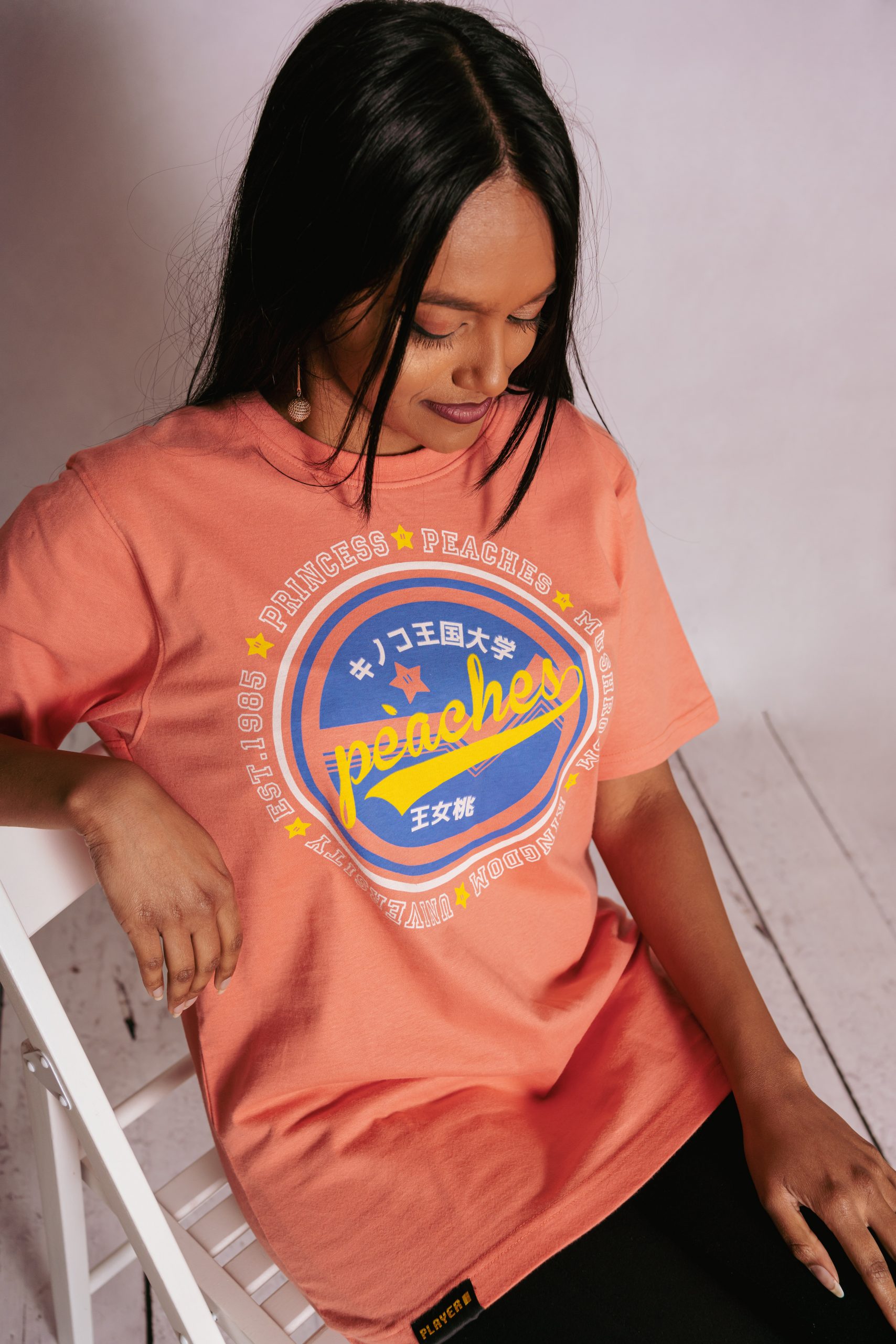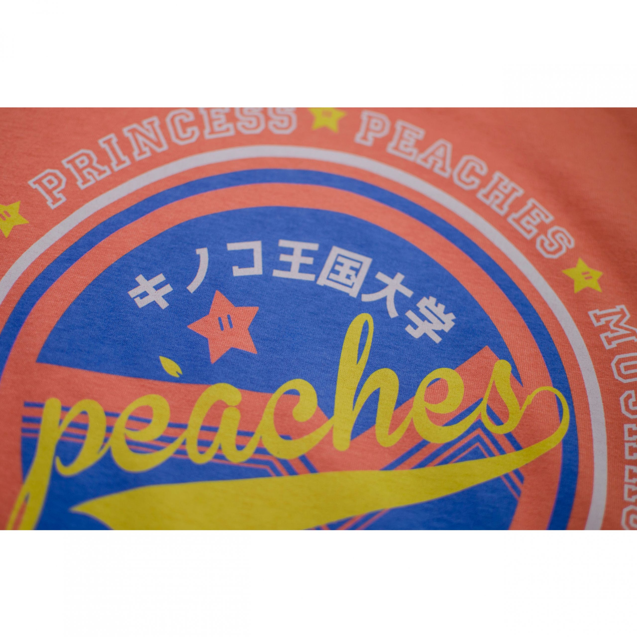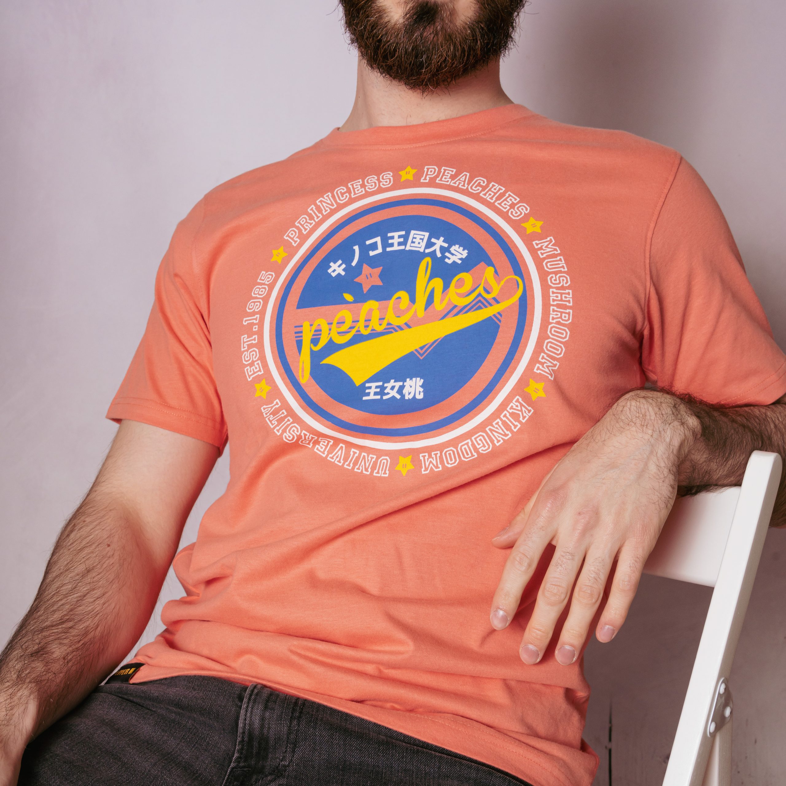 The design: The frequently captured Princess of Mushroom kingdom is depicted as being the head and name of the kingdoms college varsity teams – “The Peaches”. Included in the logo is a familiar “Star” along with princess Peaches. In addition, the text references the year she first appeared in a game – 1985. The kanji text translates to Mushroom Kingdom University. As with the entire range, we have referenced the retro Famicom swoosh that was present on the original NES/Famicom game releases.