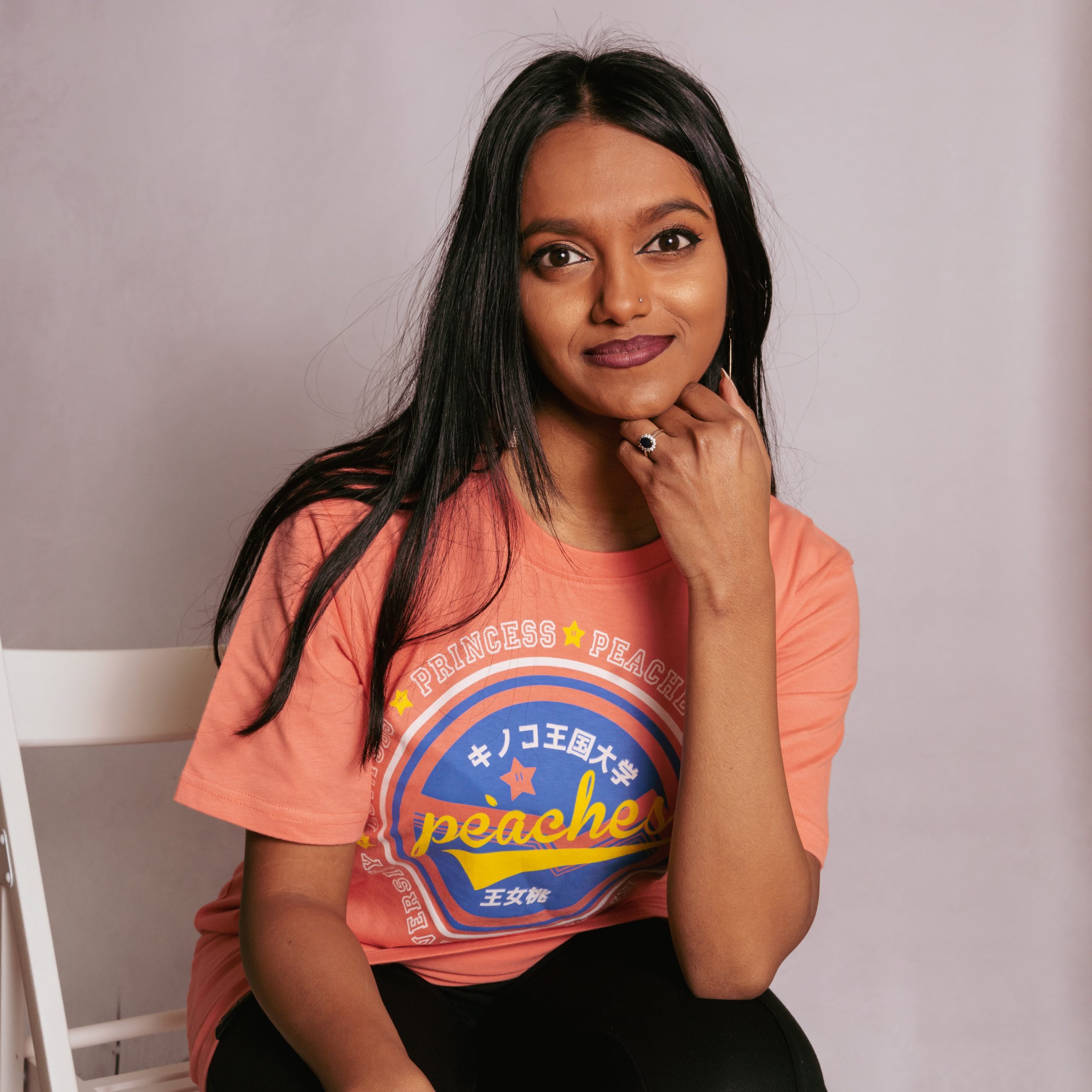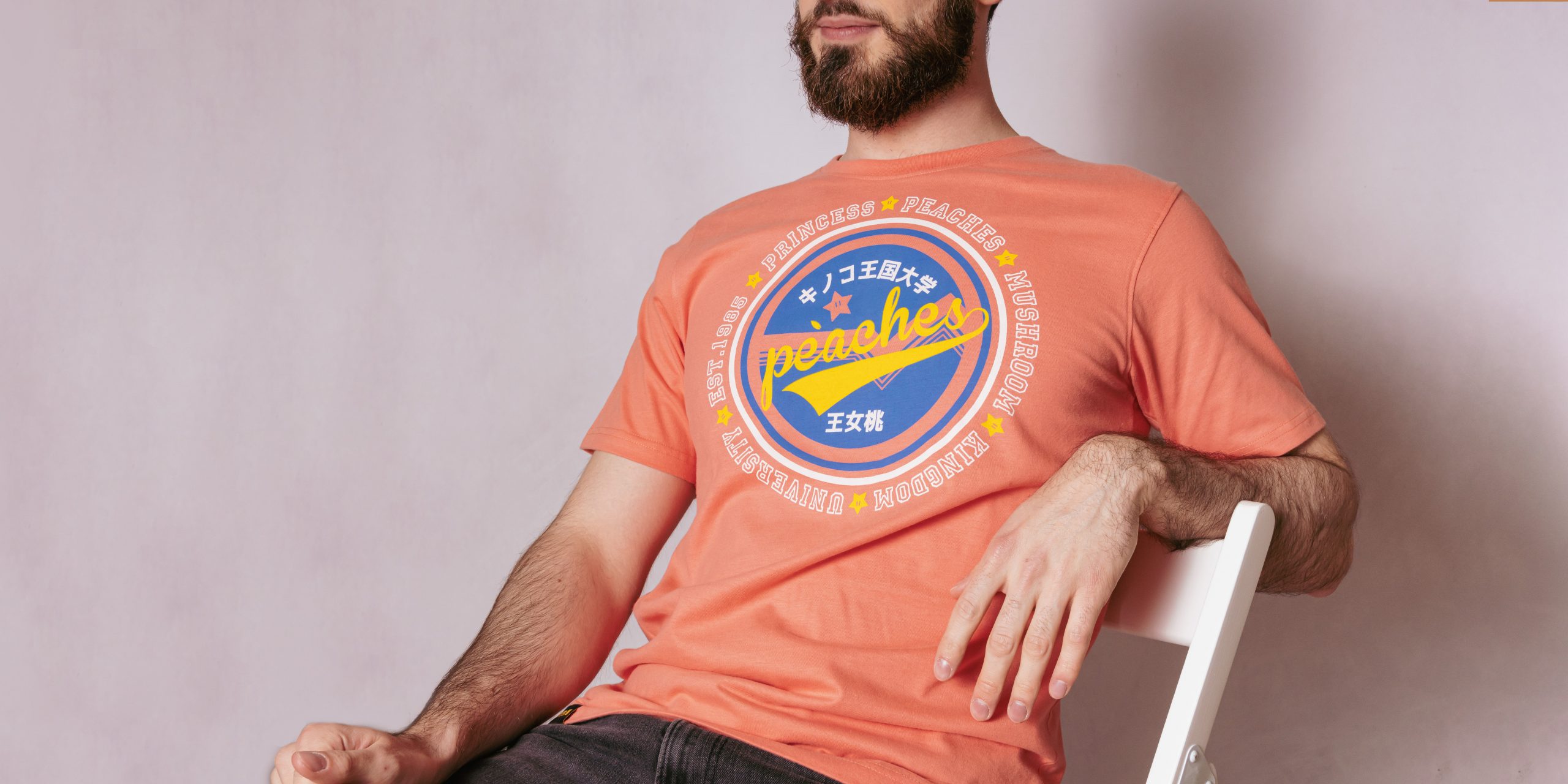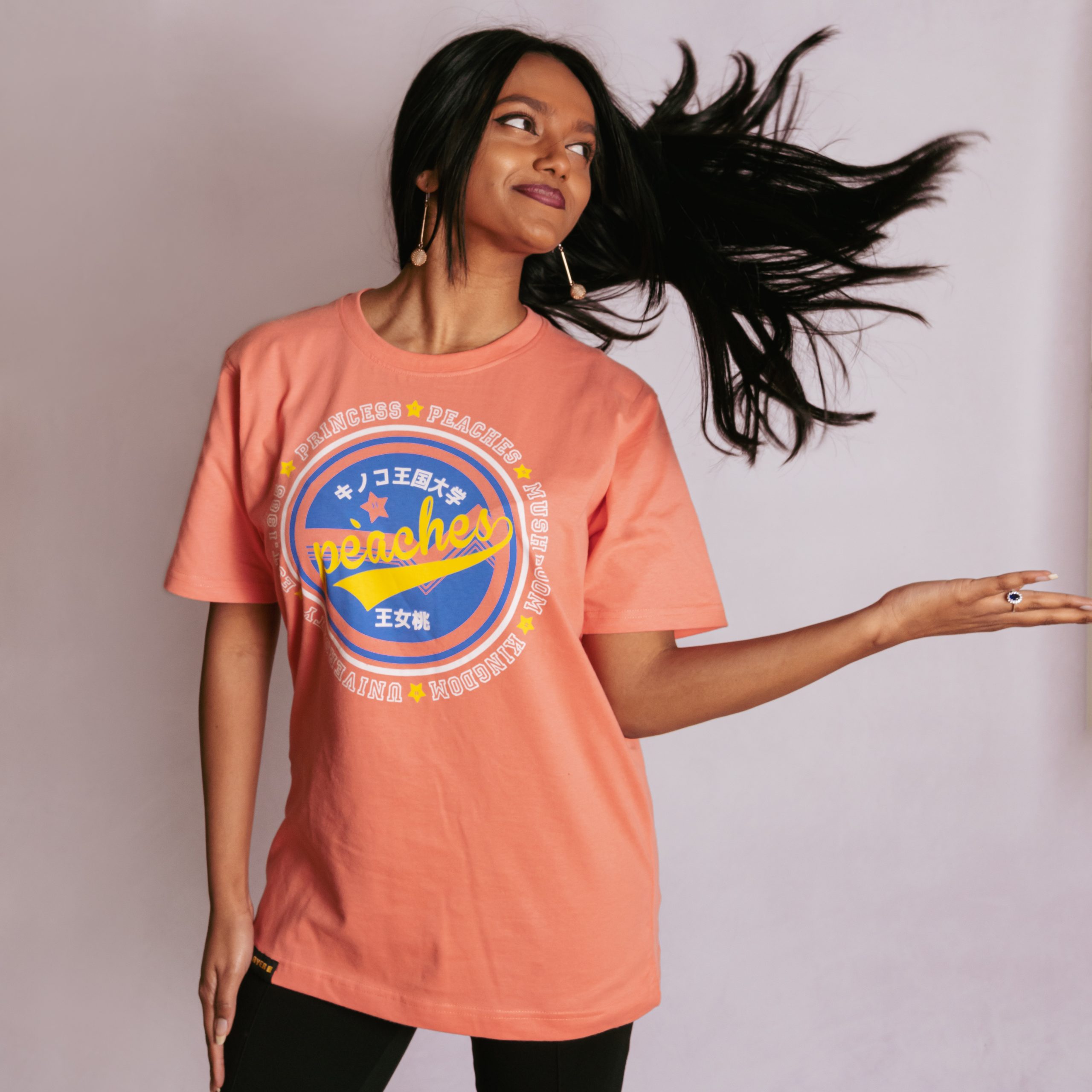 The design: The frequently captured Princess of Mushroom kingdom is depicted as being the head and name of the kingdoms college varsity teams – “The Peaches”. Included in the logo is a familiar “Star” along with princess Peaches. In addition, the text references the year she first appeared in a game – 1985. The kanji text translates to Mushroom Kingdom University. As with the entire range, we have referenced the retro Famicom swoosh that was present on the original NES/Famicom game releases.