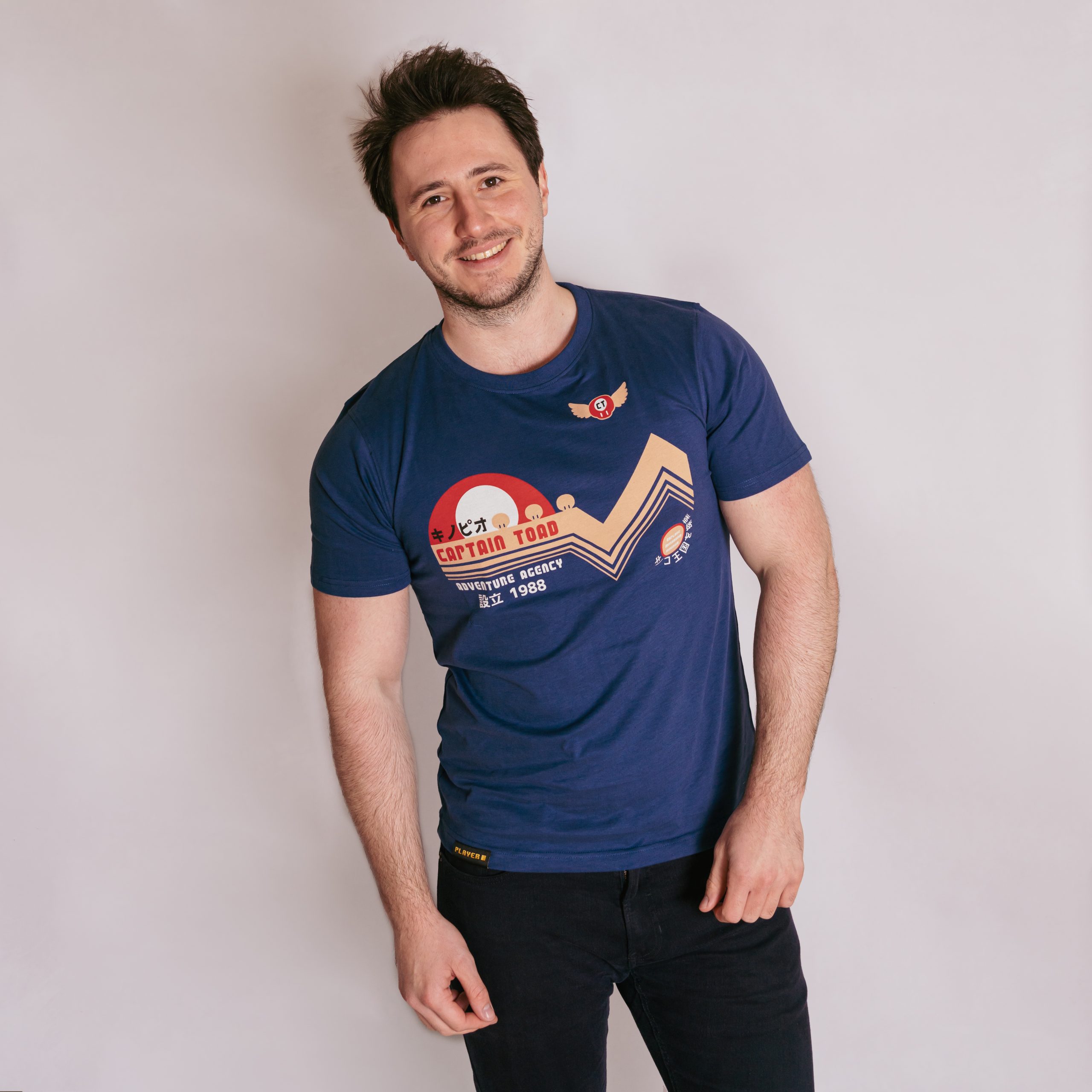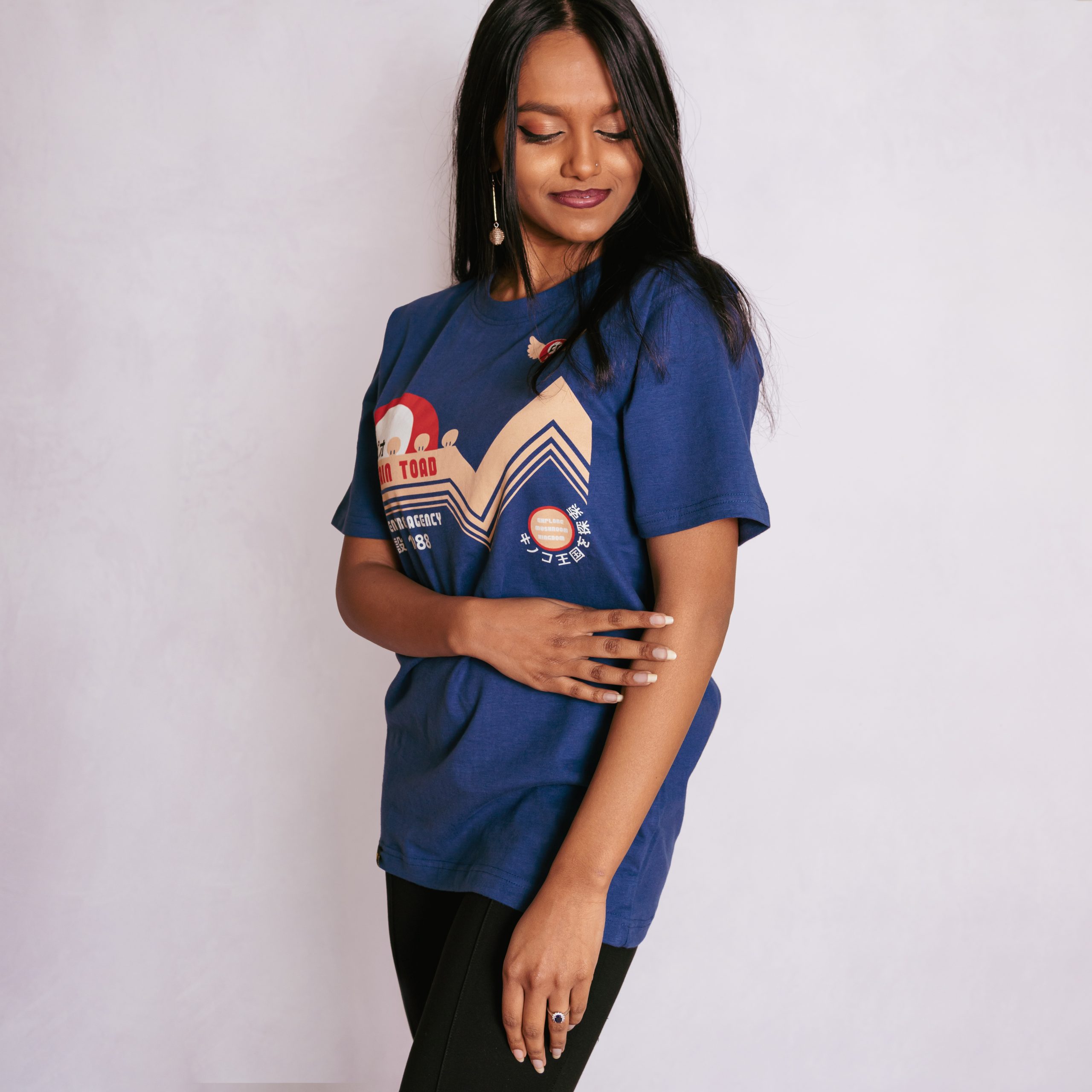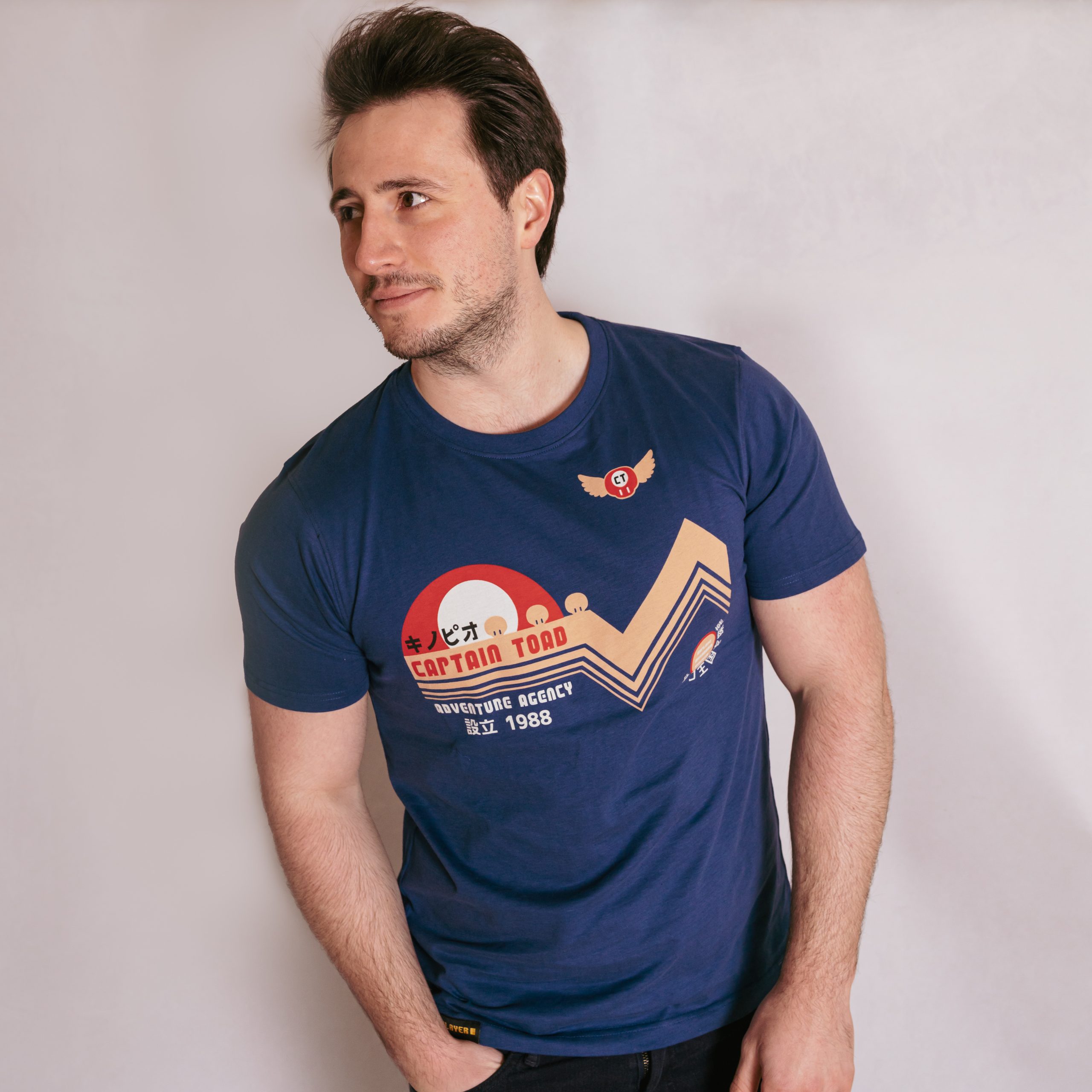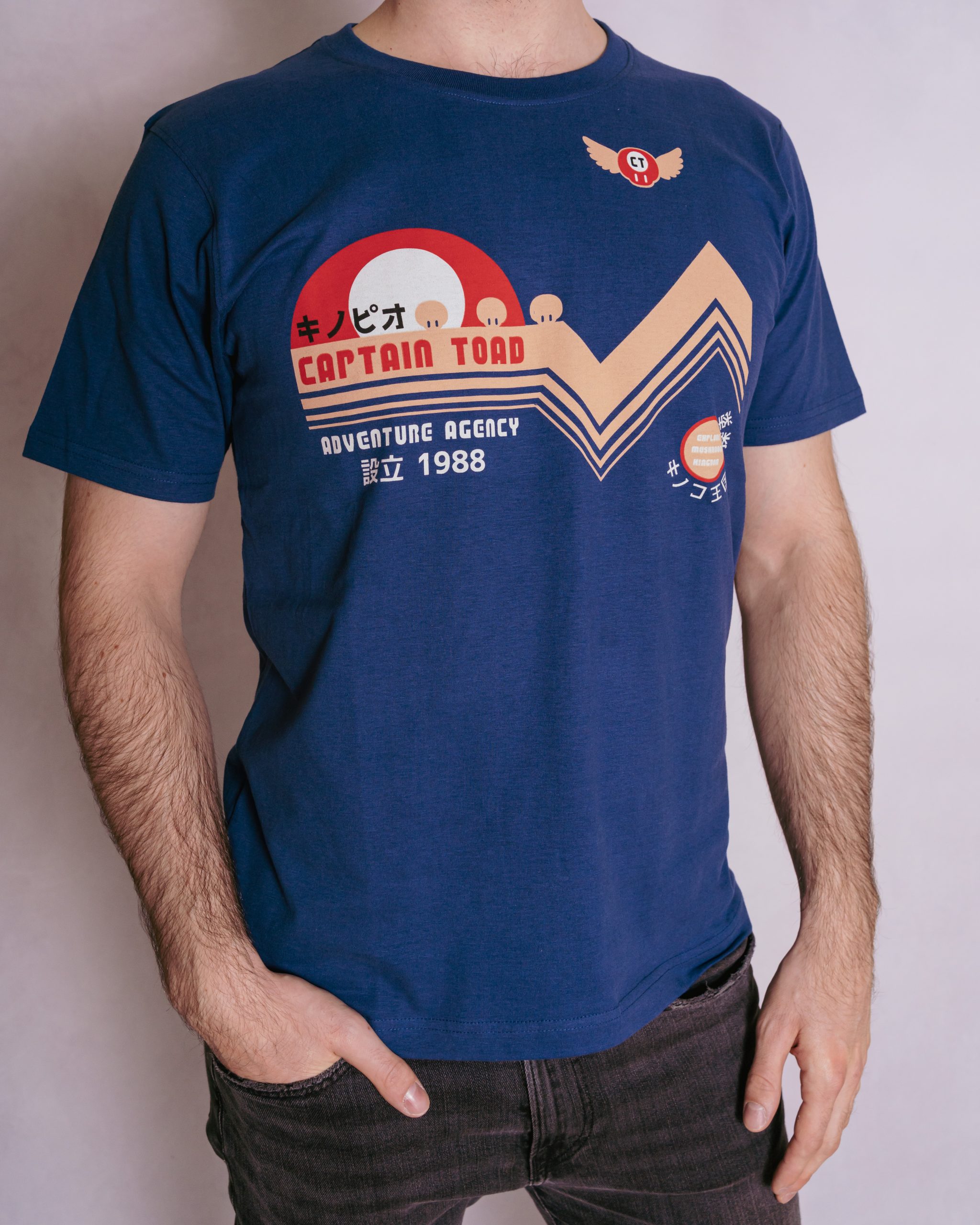 The design: Toad is the loyal attendant of Princess Peach. In this design we have imagined Toad doing what he loves, and becoming the head of a tourist agency that offers tours of Mushroom Kingdom. In the design you can see some of the familiar sights of Mushroom Kingdom like the Mushroom power up, and his unique mushroom hat –  all blended with the retro Famicom Swoosh as a backdrop The kanji text reads “Kinopio” which is his name in Japan, “established” and “explore mushroom kingdom”.