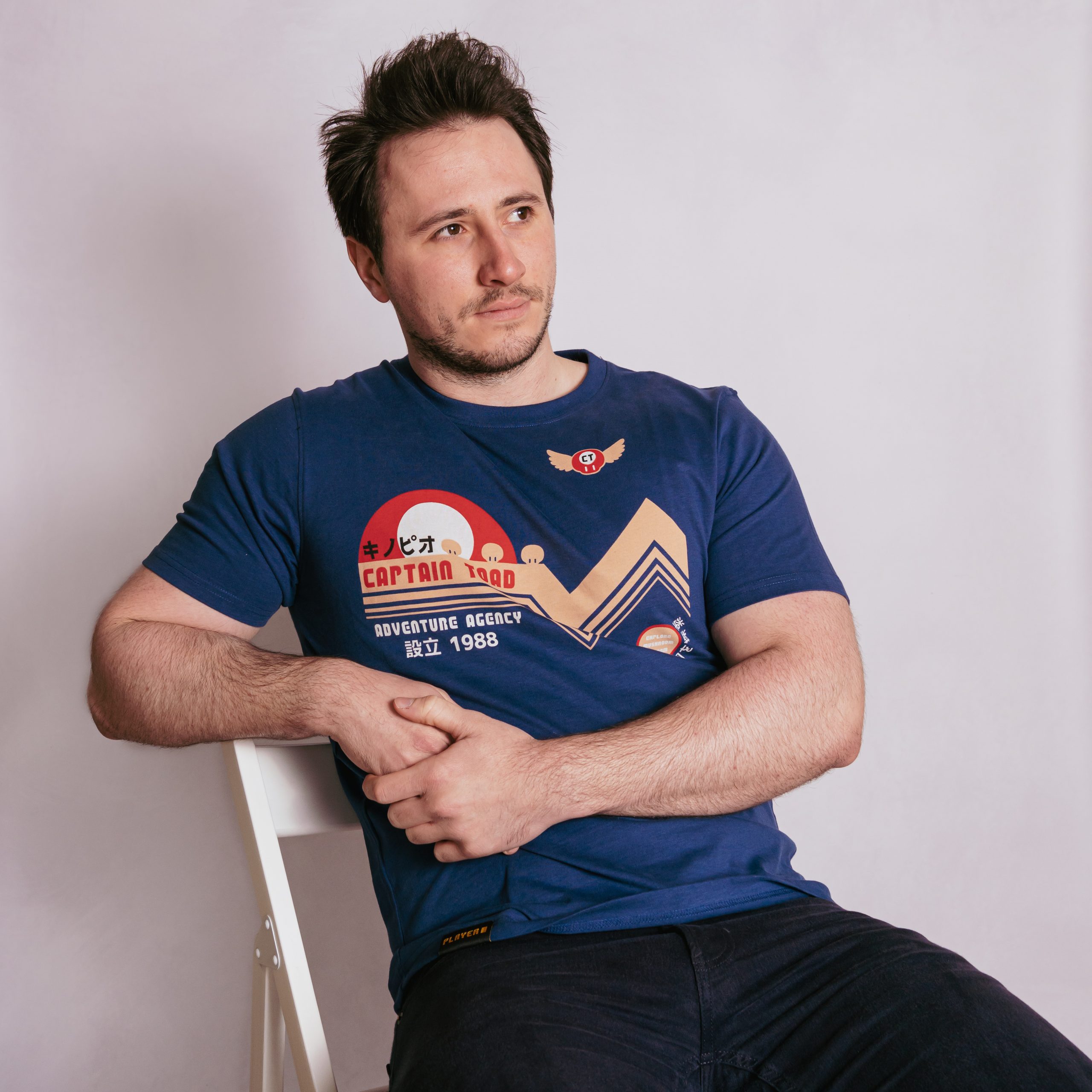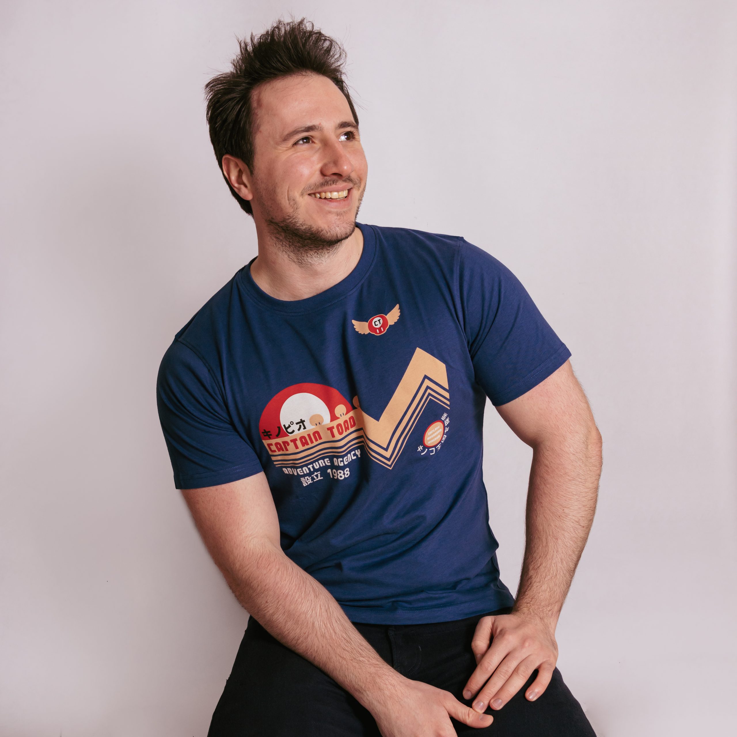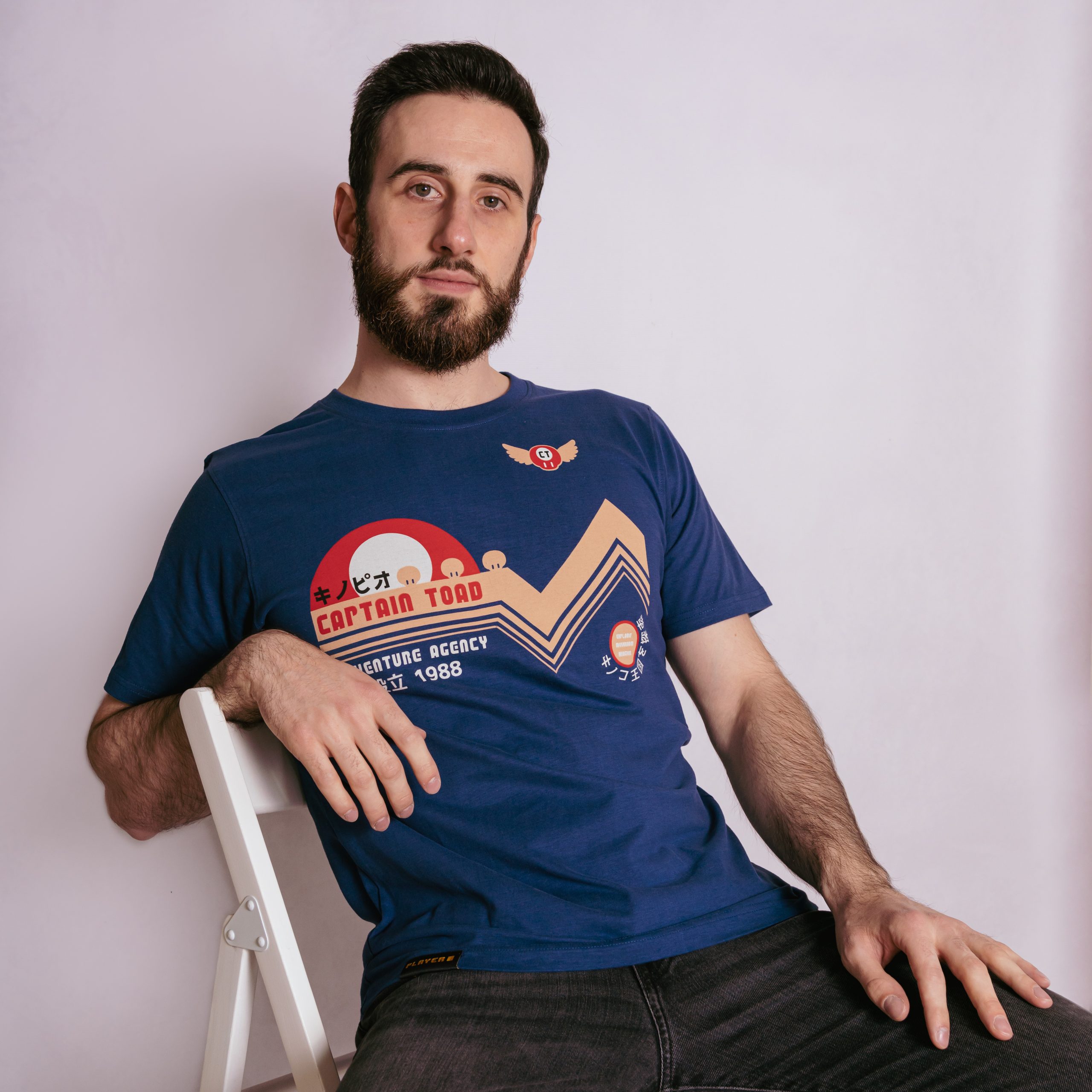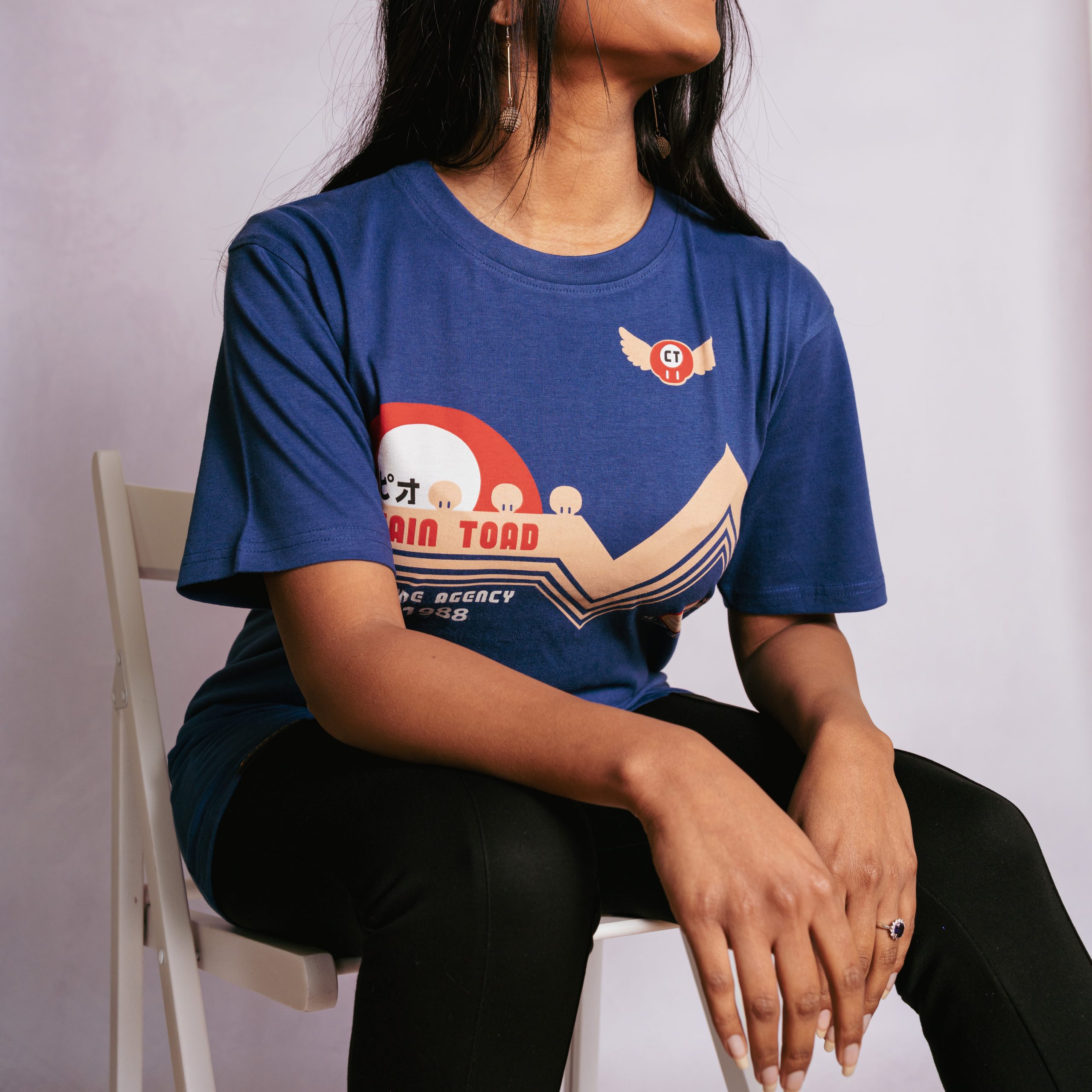 The design: Toad is the loyal attendant of Princess Peach. In this design we have imagined Toad doing what he loves, and becoming the head of a tourist agency that offers tours of Mushroom Kingdom. In the design you can see some of the familiar sights of Mushroom Kingdom like the Mushroom power up, and his unique mushroom hat –  all blended with the retro Famicom Swoosh as a backdrop The kanji text reads “Kinopio” which is his name in Japan, “established” and “explore mushroom kingdom”.